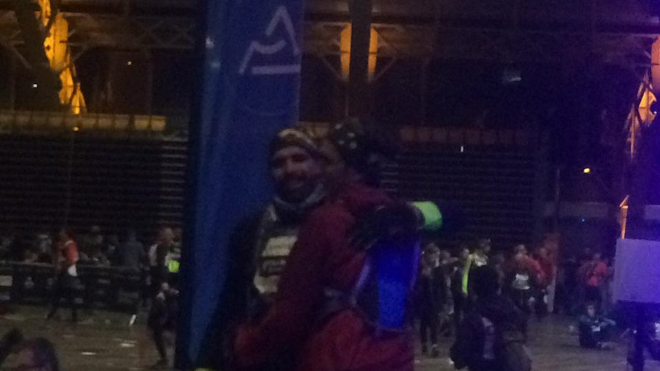 On y va à fond les manettes 5,43km/h direction Saint Les Genoux dans le Gif, là je suis frappé par une maladie rare la nuit : la somnolence ou comment t'endormir en courant! on arrive au ravito liquide et on se tire illico direction Soucieu en Jarrest de porc, là je sais que le ravito est dans un gymnase, sur la route j'ai trouvé comme Mario, une nouvelle vie et un champignon vitesse, je décide de mettre vraiment du gaz pour voir où j'en suis et ça passe, j'arrive frais comme une perche du lac au ravito, je mange comme un singe en attendant bru, qui lui arrive tel un figurant du clip de Thriller avec les jambes toutes raides et le visage un peu au bout du bout de sa vie!!! C'est un moment important dans un ultra pour les mecs normaux comme nous pas les avions de chasse....il est donc maintenant sur la ligne de sa zone de confort, va t il la dépasser ou rester là où 99% des gens restent, c'est à dire dans la limite du raisonnable, le pied dans la charantaise, le François hollande en Corrèze, le bigorneau dans la coquille... la question se pose vraiment et sincèrement je me suis écarté pour le laissé avec celle qui avait plus les mots que moi dans ce moment là, elle lui redonnera la barre de batterie qu'il faut pour connecter toutes les cases de ton état second et juste... te lever!! allez hop mon bru on y va, next Chaponost donc là stp mon bru ça descend et tu dois faire tourner les jambes et dérouler, il valide!! ok on y va, résultat je fais des séance de 1min/1min et ca passe crème 1h les 10 kil entre le 51eme et le 61eme je signe direct pour les prochaines éditions, bru me talonne et là ces parents sont là, c'est top on recharge vite fait les batteries et on se tire direction l'arche de zoé, ce sera pour moi les 10kms les plus longs de ma putain de life, la l'autre enfoiré de Mario il a jette une double carapace rouge!!!! je pense qu'à ce moment là j'ai le résultat de l'équation du théorème de Soucieu, à savoir, ravitaillement de goret des montagnes + grosse séance de vitesse derrière = montée descente de ton ravitaillement dans la goulotte qui te sert de parc d'attraction avant de gerber!! on continue notre bonhomme de chemin mais il est vrai que cette partie est vraiment nulle de chez nulle, bravo aux concurrents encore en vie après la fameuse saintétic, qui aurait pu se nommé run in bidonville, mais c'est moins vendeur pour le prix, où tu cours au milieu des cités et des clodos par terre... le mec devait être content, il pionce dehors, se gèle les meules et tu as 7000 connards qui passent devant sa couette toute la nuit qui je suis sur pris d'un remors de bourgeoisie bobo de merde se sont dit je vais le saluer!!!! Et l'autre il pionce pas!!! Tu me diras quelque part on paye le loyer et la bouffe alors on peut bien cavaler dans la cour... bref, nous voilà sur le pont et au loin on voit le père de bruno, moment magique où je comprends que quoi qu'il arrive je vais chialer, on traverse le pont où les gens sont hyper gentils, on récupère le drapeau du portugal, celui de la ville lumière et on arrive enfin chez Tony, dans sa vieille mais au combien magnifique halle, là mon bru nous fait une roulade de Ninja du turbistan de l'est et c'est à ce moment là quand je fonds en larmes dans ses bras que je comprends à quel point c'est beau ce que tu as fait... Le temps est anecdotique, les sentiments beaucoup moins. Tu l'as fait, je suis fier, et toi et Ste Ven Polak vous êtes comme mes frères... et puis au final la vie est bien faite parce que si on avait la même mère ça serait morose... voilà mon bilan de la Saintélyon 2016!!!
